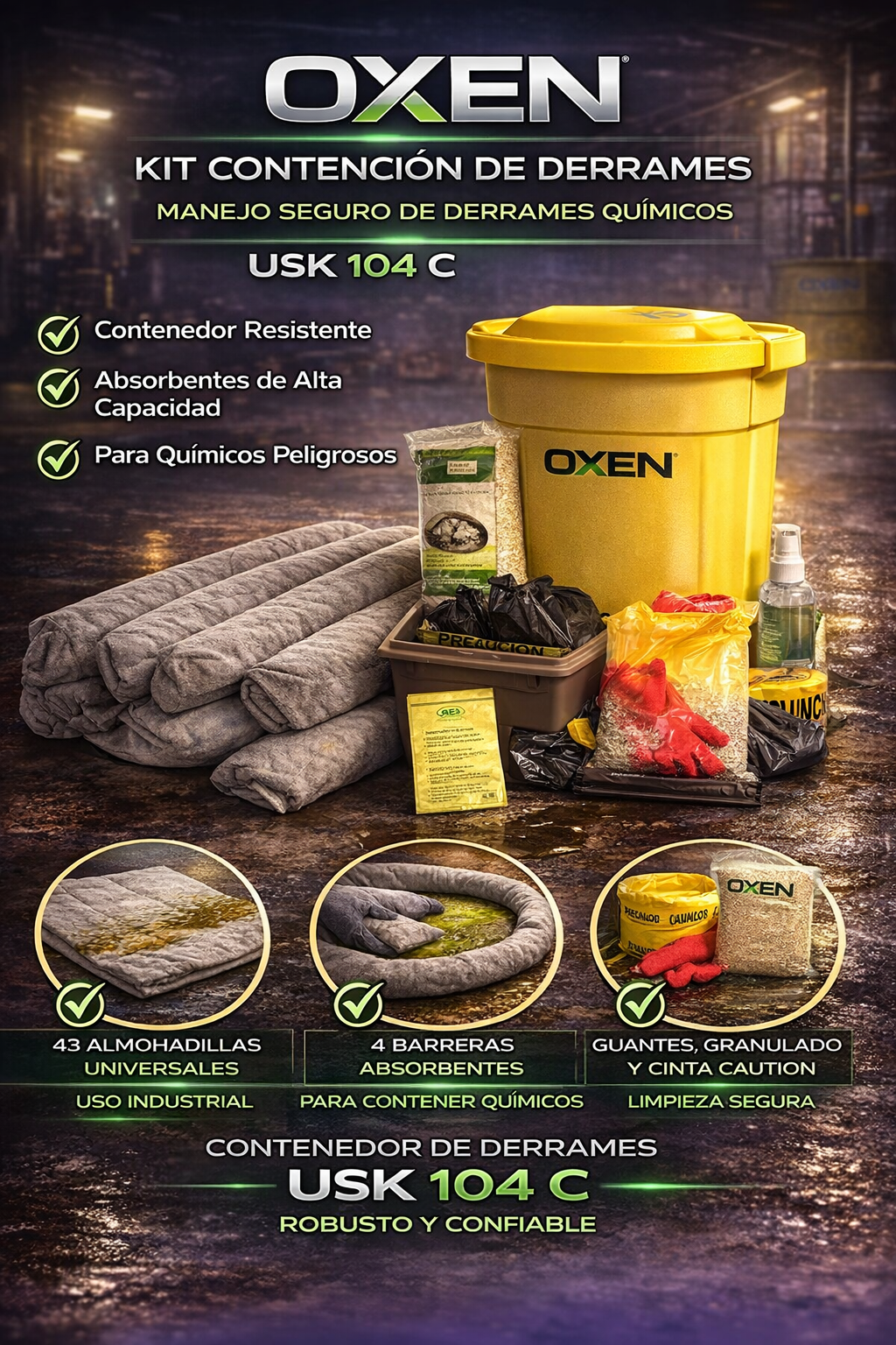 Es una solución práctica y eficiente para entornos donde se requiere movilidad y actuación inmediata frente a fugas de aceites, químicos u otros líquidos peligrosos.